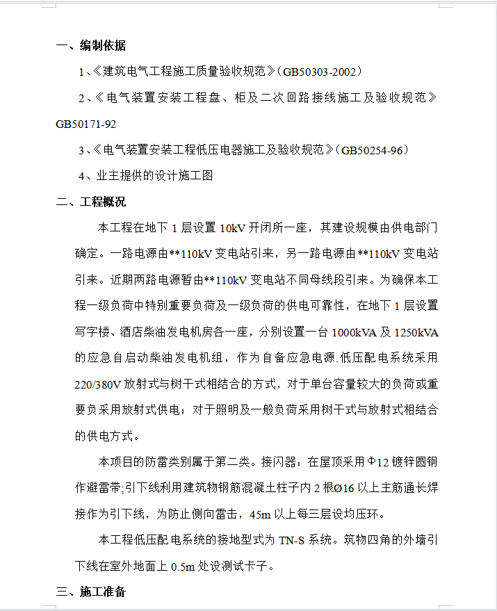 本工程在地下1层设置10kV开闭所一座,其建设规模由供电部门确定。一路电源由**110kV变电站引来,另一路电源由**110kV变电站引来。近期两路电源暂由**110kV变电站不同母线段引来。为确保本工程一级负荷中特别重要负荷及一级负荷的供电可靠性,在地下1层设置写字楼、酒店柴油发电机房各一座,分别设置一台1000kVA及1250kVA的应急自启动柴油发电机组,作为自备应急电源.低压配电系统采220/380V放射式与树干式相结合的方式,对于单台容量较大的负荷或重要负采用放射式供电;对于照明及一般负荷采用树干式与放射式相结合的供电方式。