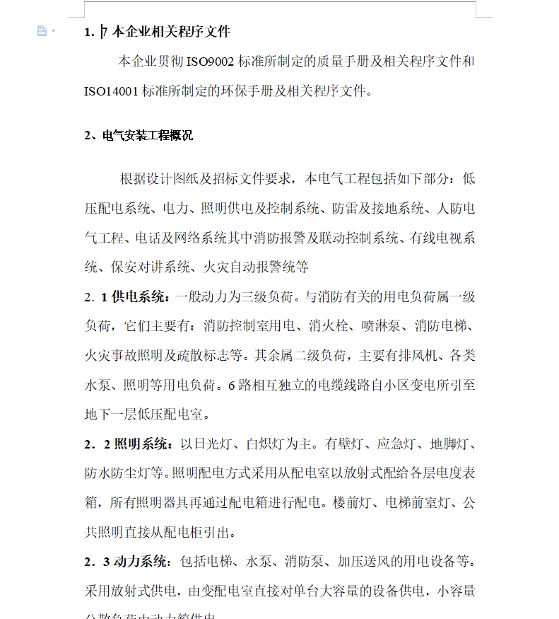 根据设计图纸及招标文件要求,本电气工程包括如下部分:低压配电系统、电力、照明供电及控制系统、防雷及接地系统、人防电气工程、电话及网络系统其中消防报警及联动控制系统、有线电视系统、保安对讲系统、火灾自动报警统等