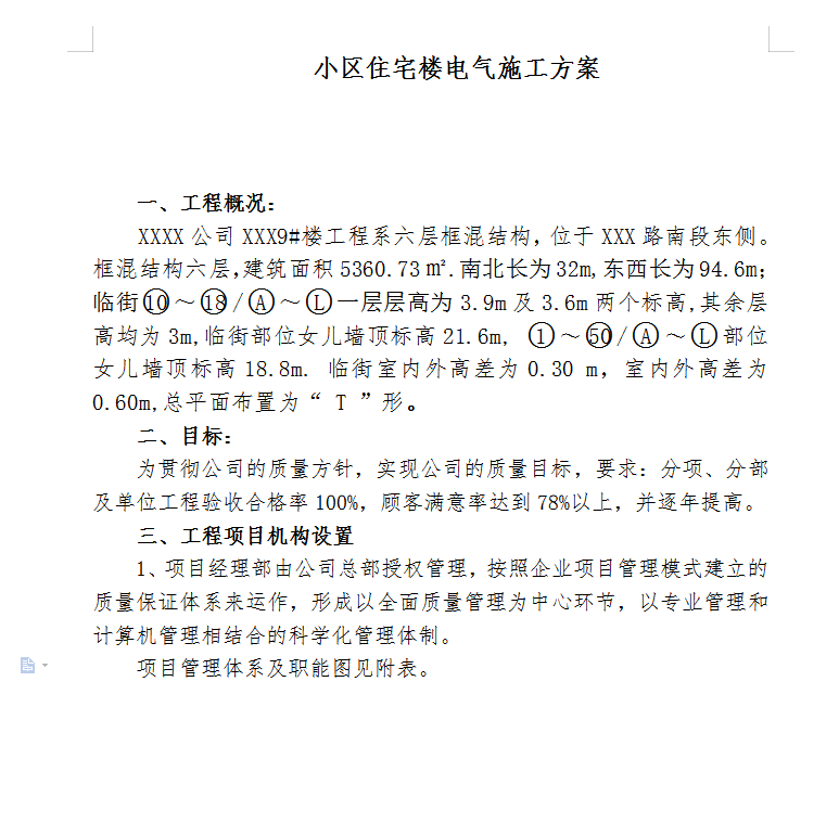 XXXX公司XXX9#楼工程系六层框混结构,位于XXX路南段东侧。框混结构六层,建筑面积5360.73㎡.南北长为32m,东西长为94.6m;临街一层层高为3.9m及3.6m两个标高,其余层高均为3m,临街部位女儿墙顶标高21.6m, 部位女儿墙顶标高18.8m. 临街室内外高差为0.30 m,室内外高差为0.60m,总平面布置为“ T ”形。