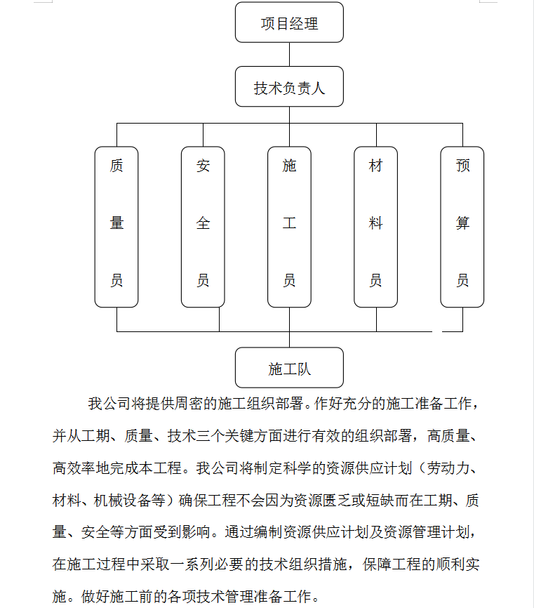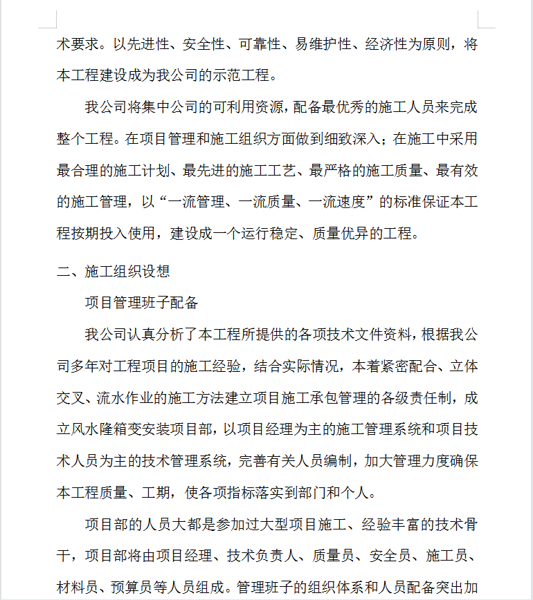 我公司将集中公司的可利用资源,配备最优秀的施工人员来完成整个工程。在项目管理和施工组织方面做到细致深入;在施工中采用最合理的施工计划、最先进的施工工艺、最严格的施工质量、最有效的施工管理,以“一流管理、一流质量、一流速度”的标准保证本工程按期投入使用,建设成一个运行稳定、质量优异的工程。