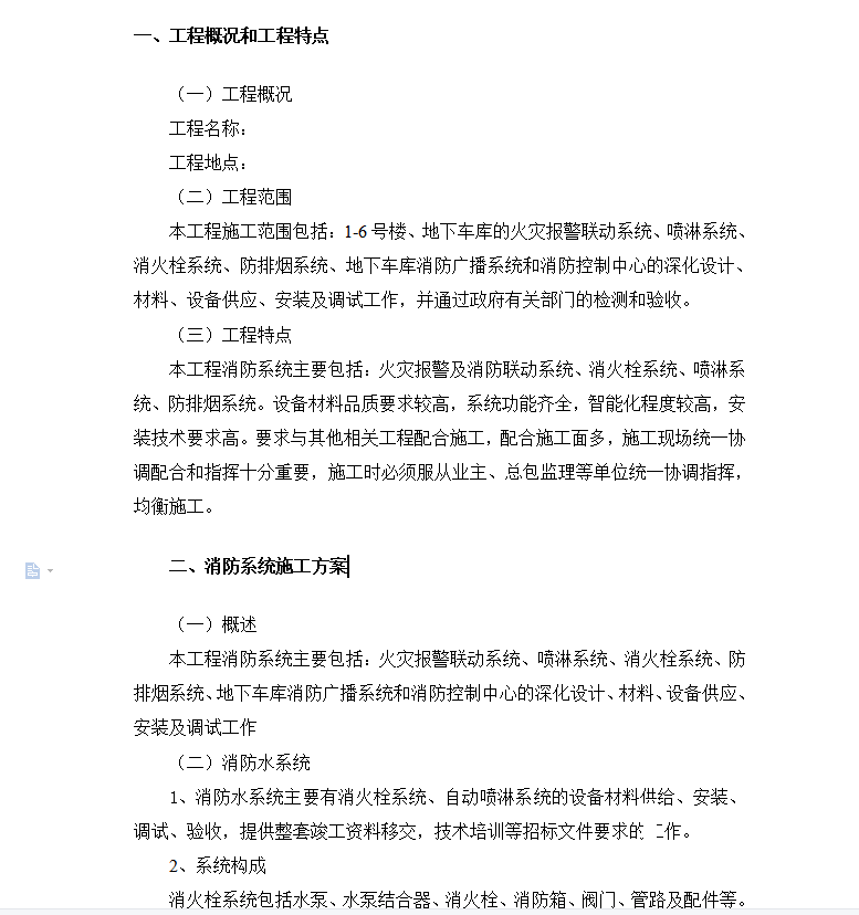 本工程消防系统主要包括:火灾报警及消防联动系统、消火栓系统、喷淋系统、防排烟系统。设备材料品质要求较高,系统功能齐全,智能化程度较高,安装技术要求高。要求与其他相关工程配合施工,配合施工面多,施工现场统一协调配合和指挥十分重要,施工时必须服从业主、总包监理等单位统一协调指挥,均衡施工。