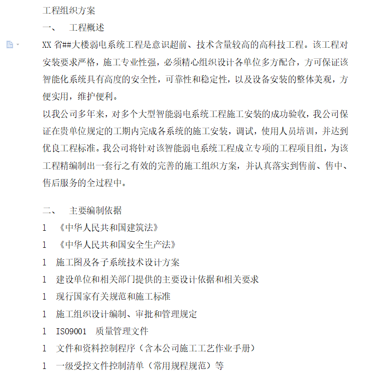 XX省##大楼弱电系统工程是意识超前、技术含量较高的高科技工程。该工程对安装要求严格,施工专业性强,必须精心组织设计各单位多方配合,方可保证该智能化系统具有高度的安全性,可靠性和稳定性,以及设备安装的整体美观,方便实用,维护便利。