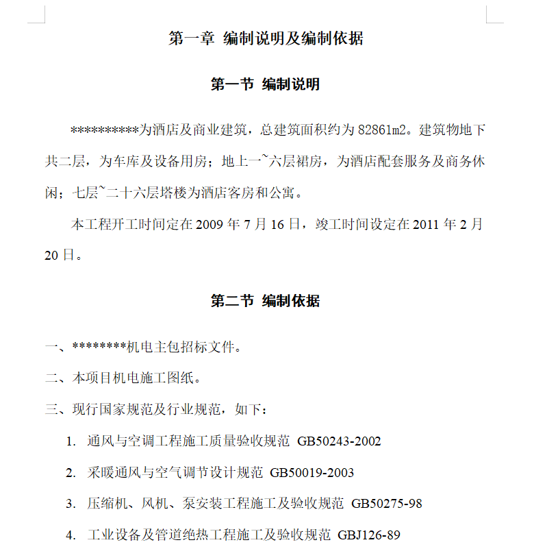 ***为酒店及商业建筑,总建筑面积约为82861m2。建筑物地下共二层,为车库及设备用房;地上一~六层裙房,为酒店配套服务及商务休闲;七层~二十六层塔楼为酒店客房和公寓。