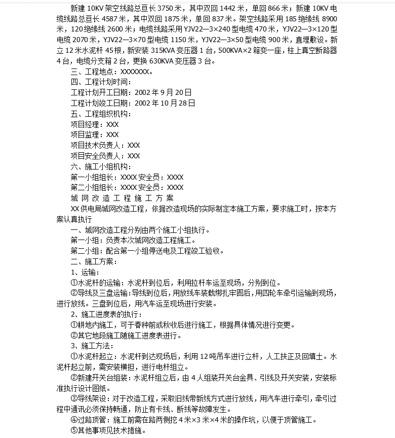 新建10KV架空线路总亘长3750米,其中双回1442米,单回866米;新建10KV电缆线路总亘长4587米,其中双回1875米,单回837米。架空线路采用185绝缘线8900米,120绝缘线2600米;电缆线路采用YJV22—3×240型电缆470米,YJV22—3×120型电缆2070米,YJV22—3×70型电缆1150米,YJV22—3×50型电缆900米,直埋敷设。新立12米水泥杆45根,新安装315KVA变压器1台,500KVA×2箱变一座,柱上真空断路器4台,电缆分支箱2台,更换630KVA变压器3台。