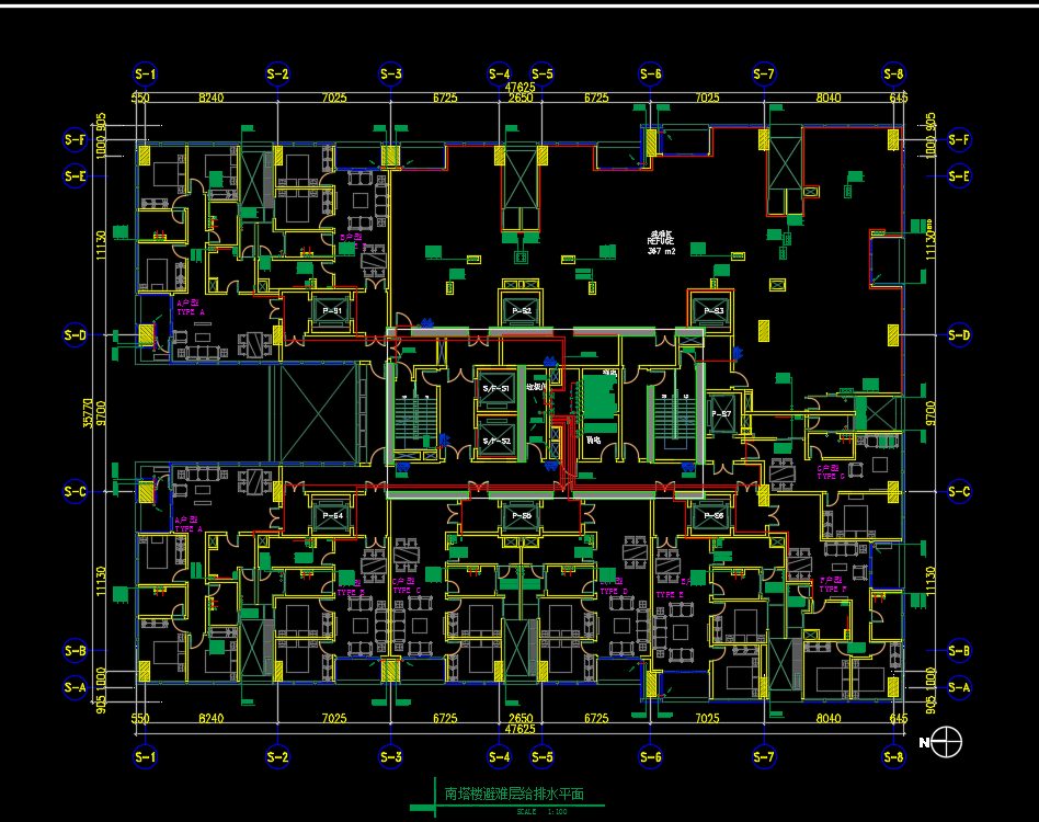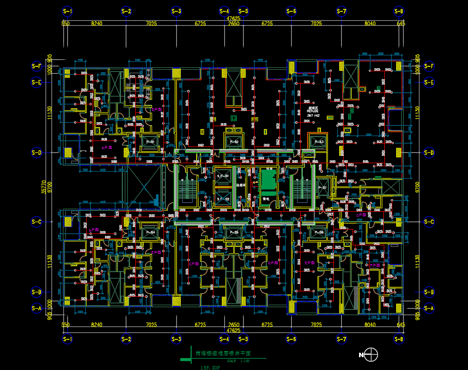 四十三层商业综合体机电施工图纸,包括:给排水消防总平面图、给排水平面图、喷淋平面图、消火栓系统原理图、喷淋系统原理图、生活排水系统原理图、电气平面图、配电系统图、电气总图、基础接地平面图、消电平面图、消电系统图、消防通风平面图、消防防烟排烟平面图、消防排烟平面图