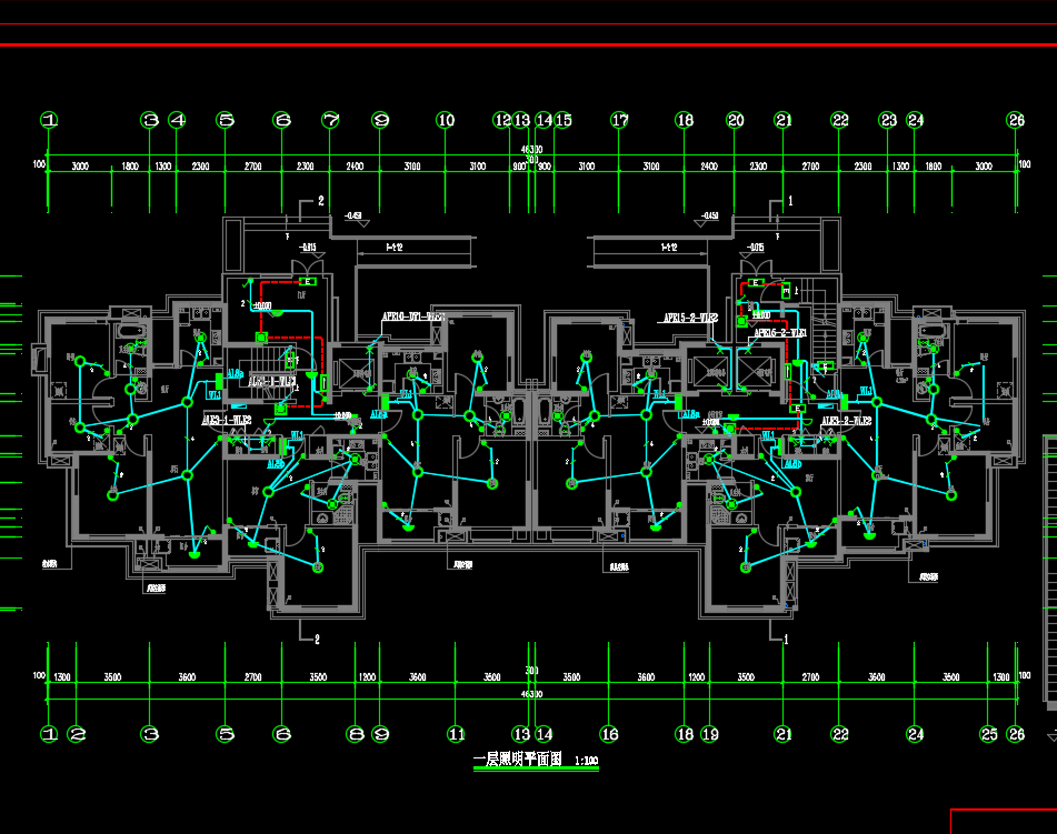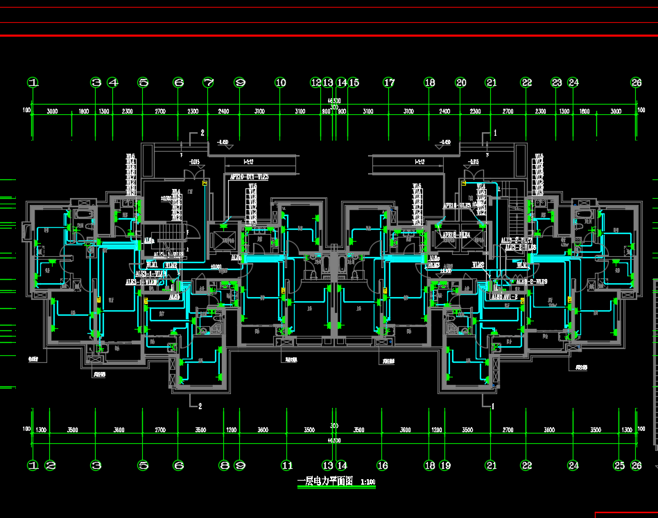 高层住宅楼电气施工图纸,包括:配电干线系统图、配电箱系统图、电力平面图、照明平面图、弱电、火灾自动报警平面图、屋顶防雷平面图、基础接地平面图