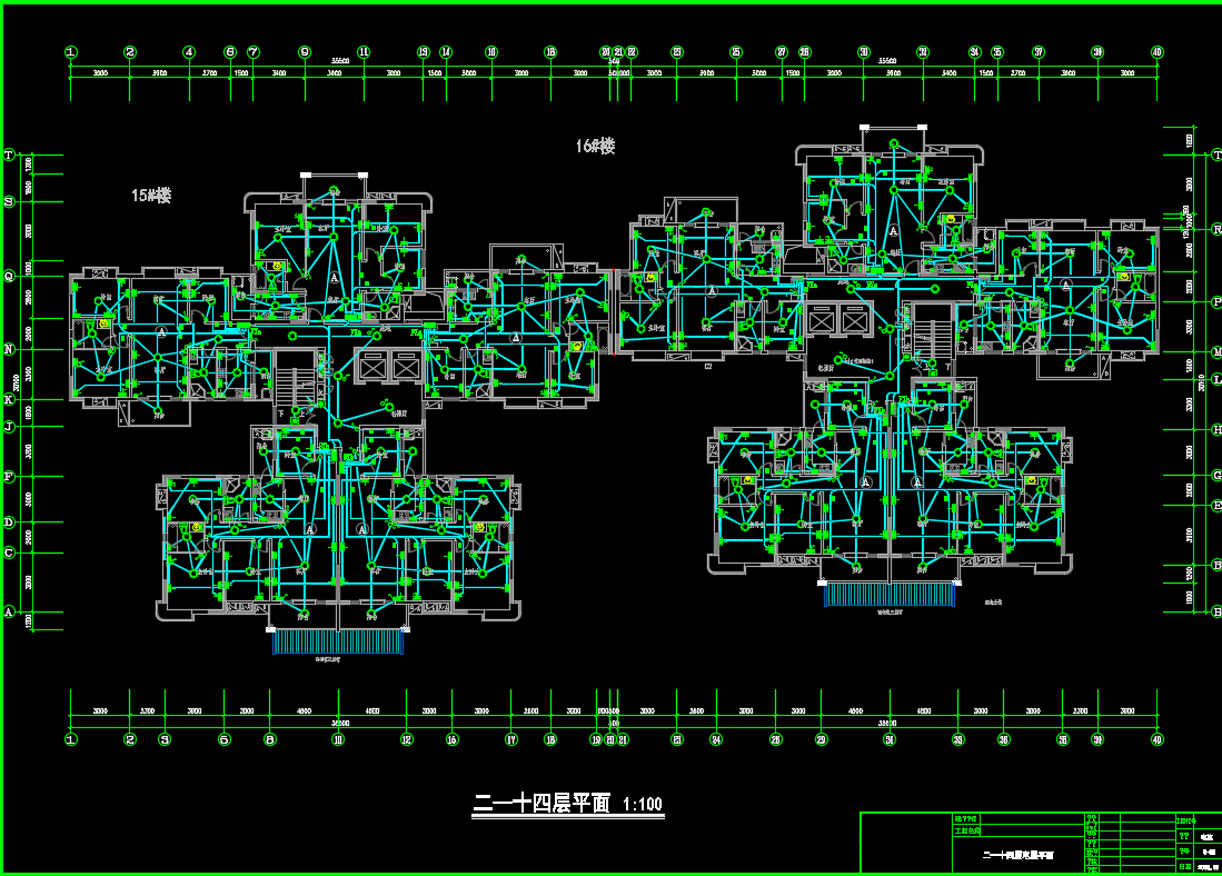十六层住宅楼强弱电图纸包括:一层平面、二—十四层平面、十五—十六层平面、屋顶防雷平面、电梯机房平面、基础平面图、电力照明配电系统图等。