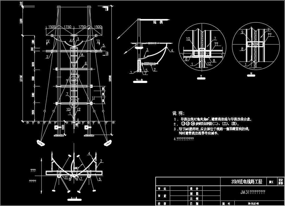 35kV送电线路工程电气施工图纸包括:电缆管卡及保护管卡制造加工图、避雷器支架、电缆支架制造图、JM31(DM1)型杆主上段加工图、主杆中段加工图、主杆下段加工图、HJM-3 横担加工图、H20-5.0避雷线横担加工图、节点详图、螺栓制造图、拉环制造图、拉线棒制造图、线路平断面图等。