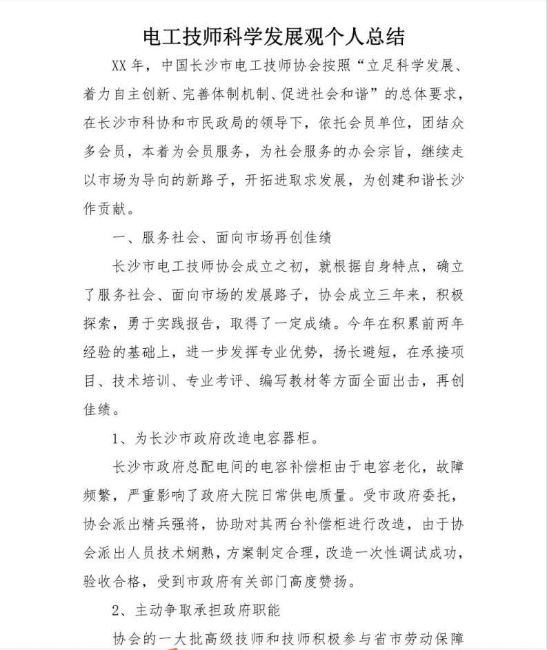 XX年,中国xx市电工技师协会按照“立足科学发展、着力自主创新、完善体制机制、促进社会和谐”的总体要求,在长沙市科协和市民政局的领导下,依托会员单位,团结众多会员,本着为会员服务,为社会服务的办会宗旨,继续走以市场为导向的新路子,开拓进取求发展,为创建和谐长沙作贡献。