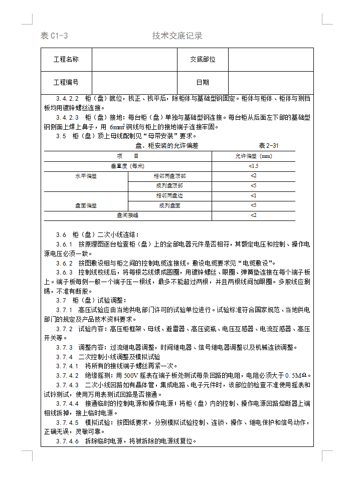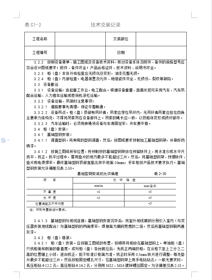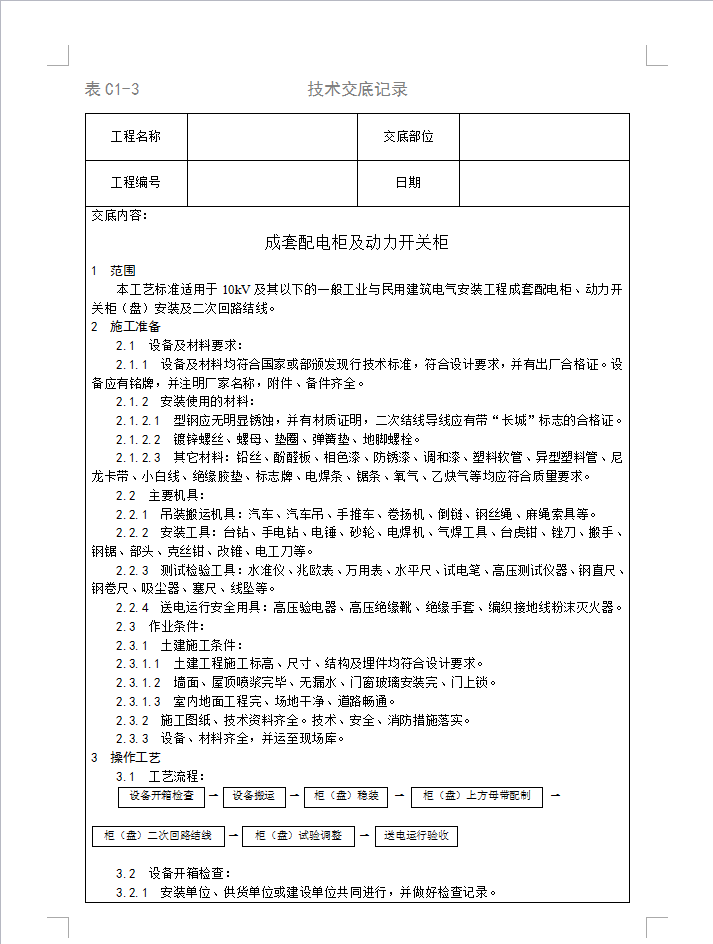 本工艺标准适用于10kV及其以下的一般工业与民用建筑电气安装工程成套配电柜、动力开关柜(盘)安装及二次回路结线。设备运输、吊装时注意事项:1 道路要事先清理,保证平整畅通。2 设备吊点。柜(盘)顶部有吊环者,吊索应穿在吊环内,无吊环者吊素应挂在四角主要承力结构处,不得将吊索吊在设备部件上。吊索的绳长应一致,以防柜体变形或损坏部件。3 汽车运输时,必须用麻绳将设备与车身固定牢,开车要平稳。