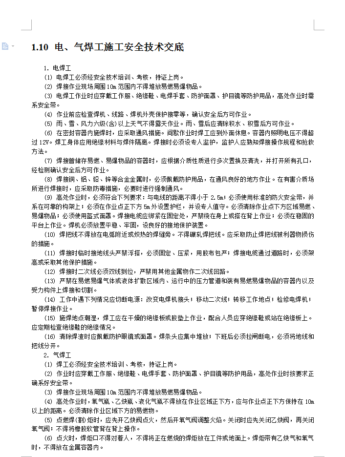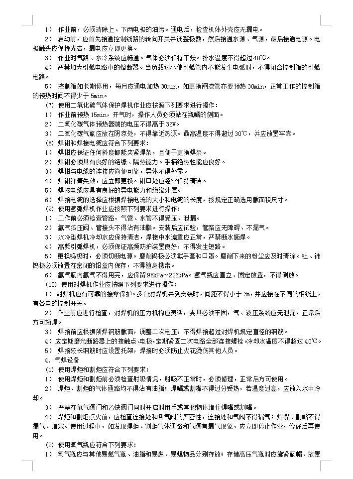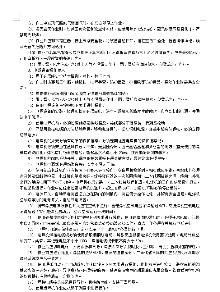 电焊工:(1) 电焊工必须经安全技术培训、考核,持证上岗。(2) 焊接作业现场周围10m范围内不得堆放易燃易爆物品。(3) 电焊工作业时应穿戴工作服、绝缘鞋、电焊手套、防护面罩、护目镜等防护用品,高处作业时需系安全带。(4) 作业前应检查焊机、线路、焊机外壳保护接零等,确认安全后方可作业。(5) 雨、雪、风力六级(含)以上天气不得露天作业。雨、雪后应清除积水、积雪后方可作业。(6) 在密封容器内施焊时,应采取通风措施。间歇作业时焊工应到外面休息。容器内照明电压不得超过12V。焊工身体应用绝缘材料与焊件隔离。焊接时必须设专人监护,监护人应熟知焊接操作规程和抢救方法。(7) 焊接曾储存易燃、易爆物品的容器时,应根据介质性质进行多次置换及清洗,并打开所有孔口,经检测确认安全后方可作业。(8) 焊接铜、铝、铅、锌等合金金属时,必须佩戴防护用品,在通风良好的地方作业。在有害介质场所进行焊接时,应采取防毒措施,必要时进行强制通风。