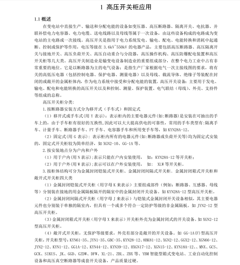 在变电站中直接生产、输送和分配电能的设备如变压器、高压断路器、隔离开关、电抗器、并联补偿电力电容器、电力电缆、送电线路以及母线等属于一次设备,由这些设备构成的电路成为变电站的主电路或一次接线。高压开关是指用于电力系统发电、输电、配电、电能转换和消耗中起通断、控制或保护等作用,电压等级在3. 6kV 550kV的电器产品,主要包括高压断路器、高压隔离开关与接地开关、高压负荷开关、高压自动重合与分段器,高压操作机构、高压防爆配电装置和高压开关柜等几大类。