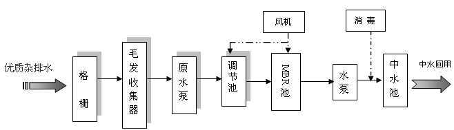 中水处理工艺流程方案选择:因本工程中水原水为淋浴排水与盥洗排水组成的优质杂排水,所以采用以物化处理为主的工艺流程(MBR).