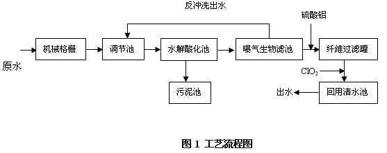 根据宾馆和生活小区污水的特点以及宾馆内外的环境特色,工程建成半地埋式。原水经过机械格栅进入调节池,经水泵提升进入水解酸化池,出水自流入曝气生物滤池。经过生物处理后的出水加入硫酸铝再通过纤维过滤罐,投加ClO2后进入回用清水池。曝气生物滤池的反冲洗出水回流到调节池,活性污泥在水解酸化池内进行消化处理。工艺流程如图1所示。