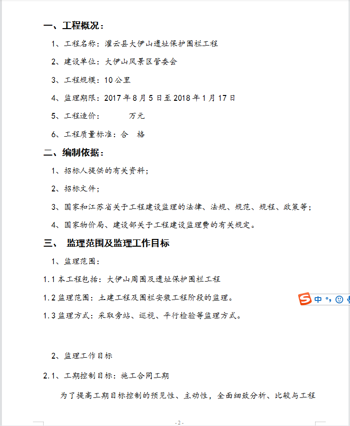 Ö÷³Ö±àдÏîÄ¿¼àÀí¹æ»®¡¢ÉóÅúÏîÄ¿¼àÀíʵʩϸÔò£¬²¢¸ºÔð¹ÜÀíÏîÄ¿¼àÀí»ú¹¹µÄÈÕ³£¹¤×÷¡£¹¤³ÌÖÊÁ¿Êǹ¤³Ì½¨ÉèµÄºËÐÄ£¬ÊǼàÀí¹¤×÷µÄÖØµã£¬±¾×ŰÙÄê´ó¼ÆÖÊÁ¿µÚÒ»µÄ·½Õ룬ͨ¹ýÖÊÁ¿¿ØÖÆÊ¹¹¤³ÌÖÊÁ¿È«²¿Âú×ãÉè¼Æ¡¢¹ú¼Ò°ä·¢µÄÓйØÑéÊÕ±ê×¼¡¢¹æ·¶¼°³Ð°üºÏͬ¹æ¶¨µÄÖÊÁ¿µÈ¼¶¡£¹¤³Ì×ÜÌåÖÊÁ¿Ä¿±êÈ·±£ºÏ¸ñ¡£¹¤³ÌÃû³Æ£º¹àÔÆÏØ´óÒÁɽÒÅÖ·±£»¤Î§À¸¹¤³Ì£»½¨É赥λ£º´óÒÁɽ·ç¾°Çø¹Üί»á£»¹¤³Ì¹æÄ££º10¹«À¼àÀíÆÚÏÞ£º2017Äê8ÔÂ5ÈÕÖÁ2018Äê1ÔÂ17ÈÕ£»¹¤³ÌÔì¼Û£ºÍòÔª£»¹¤³ÌÖÊÁ¿±ê×¼£ººÏ ¸ñ¡£