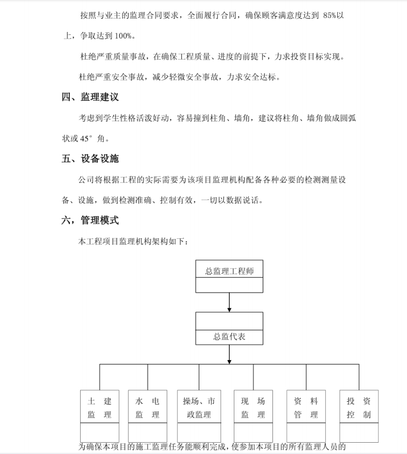 ¹¤³Ì¹æÄ£:·çÓê²Ù³¡½¨ÖþÃæ»ý5100 m', 6ºÅѧÉúËÞÉá8000 m'£¬¹²¼Æ13100?£»¹¤³ÌÔì¼Û:·çÓê²Ù³¡Ô¼500ÍòÔª£¬Ñ§ÉúËÞÉáÔ¼800ÍòÔª£¬¹²¼ÆÔ¼13000ÍòÔª£»¼àÀí¹¤×÷·¶Î§:Ê©¹¤ÆÚÄÚµÄÖÊÁ¿¿ØÖÆ¡¢Í¶×Ê¿ØÖÆ¡¢½ø¶È¿ØÖÆ¡¢×é֯Эµ÷¡¢ºÏͬ¹ÜÀí¡¢°²È«ÎÄÃ÷µÄÊ©¹¤¼àÀí¹¤×÷£¬×éÖ¯¿¢¹¤ÑéÊÕ¡¢½áËãÔì¼ÛµÄÉóºËµÈ(×îÖÕÒÔ¼àÀíºÏͬԼ¶¨Îª×¼)¡£