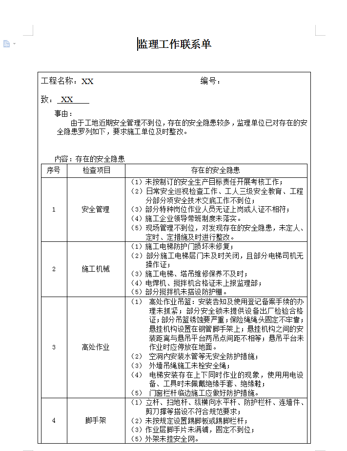 本文为房建工程现场安全隐患监理工作联系单,供大家参考。
