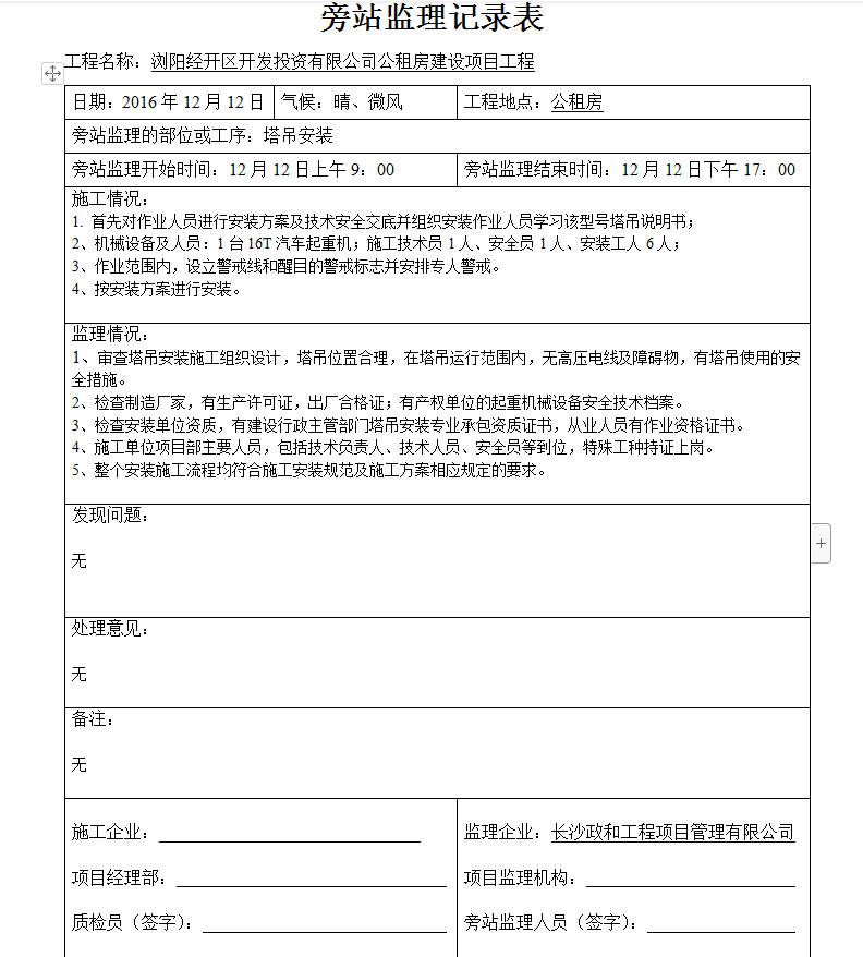 ¼àÀíÇé¿ö£ºÉó²éËþµõ°²×°Ê©¹¤×éÖ¯Éè¼Æ£¬ËþµõλÖúÏÀí£¬ÔÚËþµõÔËÐз¶Î§ÄÚ£¬ÎÞ¸ßѹµçÏß¼°Õϰ­ÎÓÐËþµõʹÓõݲȫ´ëÊ©¡£¼ì²éÖÆÔì³§¼Ò£¬ÓÐÉú²úÐí¿ÉÖ¤£¬³ö³§ºÏ¸ñÖ¤£»ÓвúȨµ¥Î»µÄÆðÖØ»úеÉ豸°²È«¼¼Êõµµ°¸¡£¼ì²é°²×°µ¥Î»×ÊÖÊ£¬Óн¨ÉèÐÐÕþÖ÷¹Ü²¿ÃÅËþµõ°²×°×¨Òµ³Ð°ü×ÊÖÊÖ¤Ê飬´ÓÒµÈËÔ±ÓÐ×÷Òµ×ʸñÖ¤Ê顣ʩ¹¤µ¥Î»ÏîÄ¿²¿Ö÷ÒªÈËÔ±£¬°üÀ¨¼¼Êõ¸ºÔðÈË¡¢¼¼ÊõÈËÔ±¡¢°²È«Ô±µÈµ½Î»£¬ÌØÊ⹤ÖÖ³ÖÖ¤Éϸڡ£