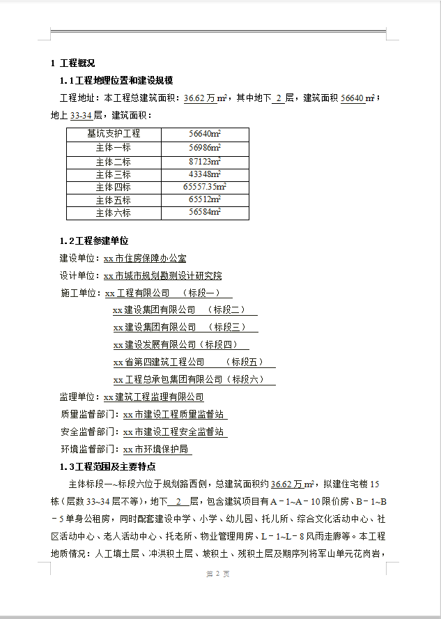 总建筑面积约36.62万m2,拟建住宅楼15栋(层数33~34层不等),地下 2 层,包含建筑项目有A-1~A-10限价房、B-1~B-5单身公租房,同时配套建设中学、小学、幼儿园、托儿所、综合文化活动中心、社区活动中心、老人活动中心、托老所、物业管理用房、L-1~L-8风雨走廊等。本工程采用的工程桩:高层住宅裙楼部分采用静压预应力管桩基础,塔楼部分采用冲孔桩、静压预应力管桩基础,桩端持力层为强风化岩层;中学、小学、幼儿园等多层公建用房采用静压预应力管桩。