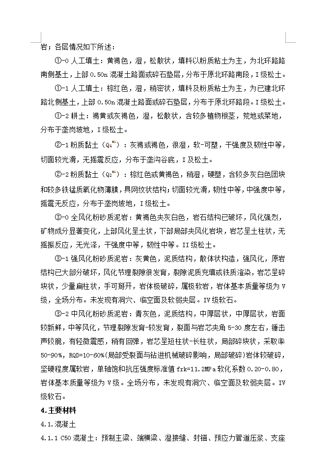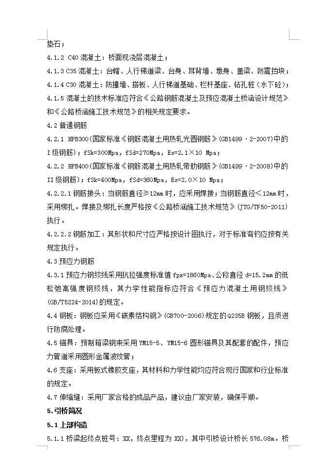 1.1XX市XX工程是XX的一条城市主干道,本次设计为XX跨越XX立交桥桥梁工程引桥及人行梯道施工图设计。1.2本桥设计起点里程为B+K4+373.397(桥台耳墙尾端),终点里程为BK5+079.477(桥台耳墙尾端),全长706.08米,其中引桥部分长576.08米。上部结构采用预应力混凝土(后张)简支小箱梁,桥面连续。1.3西侧引桥共计2联:3x30m+4x30m,东侧引桥共计3联:4x30m+4x30m+4x30m。上部结构采用30m预应力混凝土简支小箱梁、桥面连续。小箱梁采用梁场预制、现场架设方法施工:下部结构1#至6#、21#至22#桥墩采用桩接盖梁桥墩,12#至20#桥墩采用桩柱式桥墩,0#、23#桥台采用桩接盖梁桥台。桩基础均采用钻孔灌注桩基础,按嵌岩桩设计,持力层为中风化粉砂质泥岩,要求嵌入岩层不小于2.5倍的D。引桥在0#台、3#、15墩、23#台处分别设置一道D80型的伸缩缝;30m小箱梁采用板式橡胶支座。