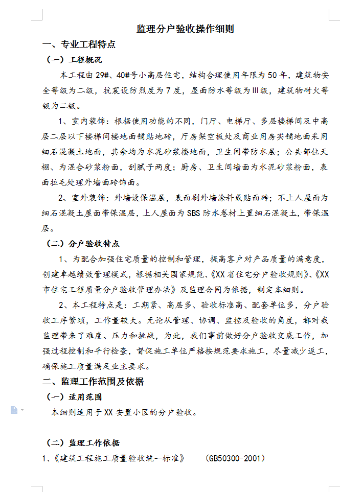 本工程由29#、40#号小高层住宅,结构合理使用年限为50年,建筑物安全等级为二级,抗震设防烈度为7度,屋面防水等级为Ⅲ级,建筑物耐火等级为二级。1、室内装饰:根据使用功能的不同,门厅、电梯厅、多层楼梯间及中高层二层以下楼梯间楼地面铺贴地砖,厅房架空板处及商业用房实铺地面采用细石混凝土地面,其余均为水泥砂浆楼地面,卫生间带防水层;公共部位天棚、为混合砂浆粉面,刮腻子两度;厨房、卫生间墙面为水泥砂浆粉面,表面拉毛处理外墙面砖饰面。 2、室外装饰:外墙设保温层,表面刷外墙涂料或贴面砖;不上人屋面为细石混凝土屋面带保温层,上人屋面为SBS防水卷材上置细石混凝土,带保温层。