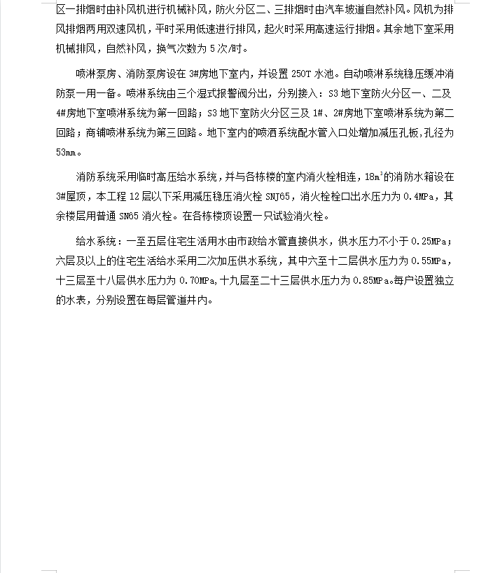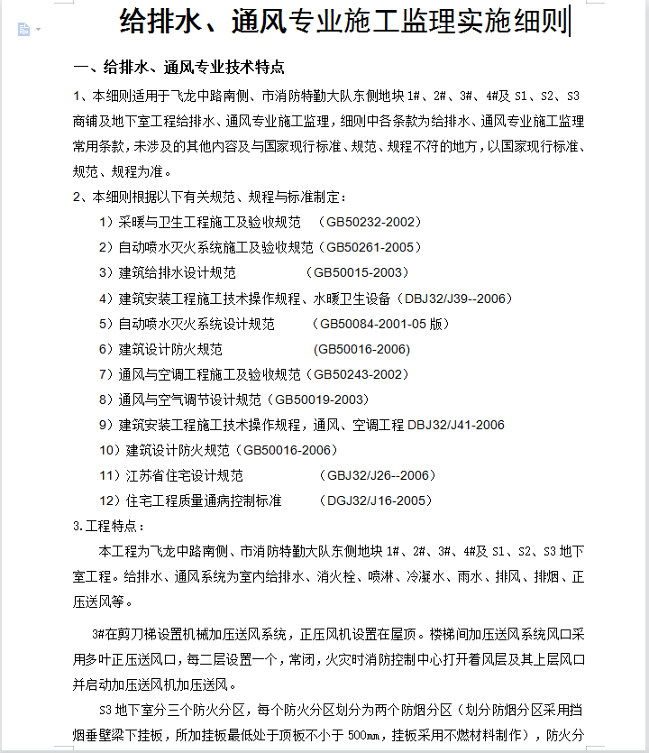 本工程为飞龙中路南侧、市消防特勤大队东侧地块1#、2#、3#、4#及S1、S2、S3地下室工程。给排水、通风系统为室内给排水、消火栓、喷淋、冷凝水、雨水、排风、排烟、正压送风等。本细则适用于飞龙中路南侧、市消防特勤大队东侧地块1#、2#、3#、4#及S1、S2、S3商铺及地下室工程给排水、通风专业施工监理,细则中各条款为给排水、通风专业施工监理常用条款,未涉及的其他内容及与国家现行标准、规范、规程不符的地方,以国家现行标准、规范、规程为准。