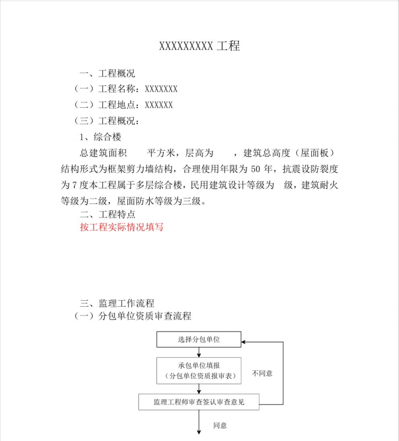 ±¾¹¤³Ì×ܽ¨ÖþÃæ»ýxxxƽ·½Ã×£¬²ã¸ßΪxxx£¬ ½¨Öþ×ܸ߶È(ÎÝÃæ°å)½á¹¹ÐÎʽΪ¿ò¼Ü¼ôÁ¦Ç½½á¹¹£¬ºÏÀíʹÓÃÄêÏÞΪ50Ä꣬¿¹ÕðÉè·ÀÁѶÈΪ7¶È±¾¹¤³ÌÊôÓÚ¶à²ã×ÛºÏÂ¥£¬ÃñÓý¨ÖþÉè¼ÆµÈ¼¶Îª¼¶£¬ ½¨ÖþÄÍ»ðµÈ¼¶Îª¶þ¼¶£¬ÎÝÃæ·ÀË®µÈ¼¶ÎªÈý¼¶¡£