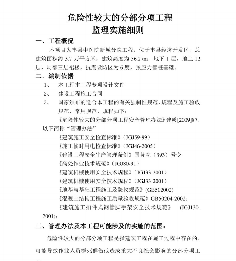 本项目为丰县中医院新城分院工程,位于丰县经济开发区,总建筑面积约3.7万平方米,建筑高度为56.27m,地下1层,地上12层,局部三层裙楼,抗震设防区为6度,预应力管桩基础。危险性较大的分部分项工程是指建筑工程在施工过程中存在的、可能导致作业人员群死群伤或造成重大不良社会影响的分部分项工程。