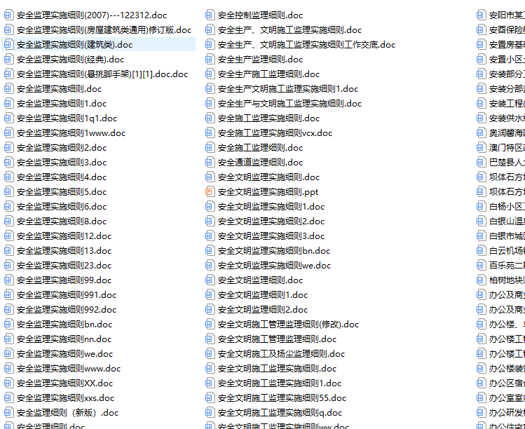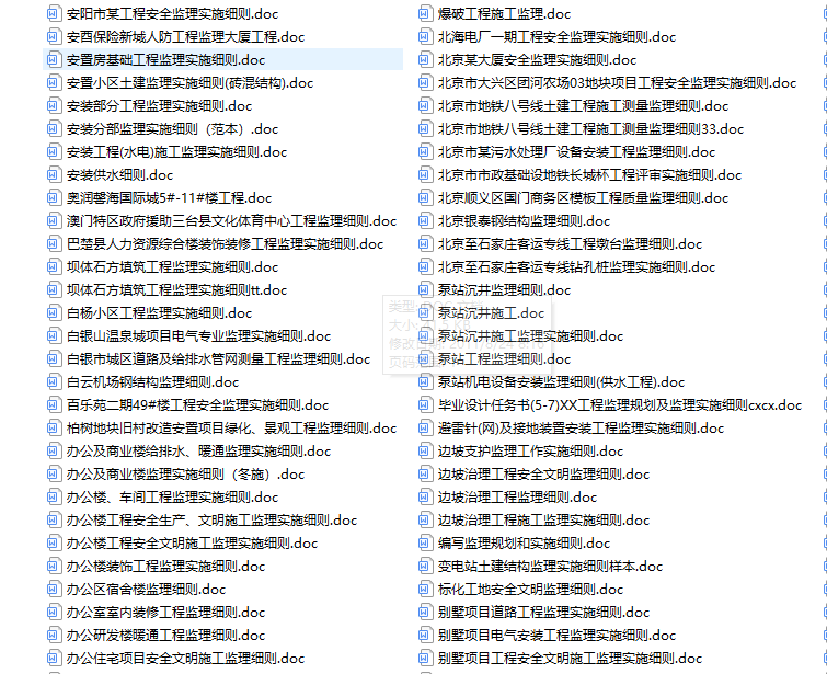 2973份工程监理实施细则包括安全生产、文明施工监理实施细则、防水工程监理实施细则、建筑材料监理实施细则、建筑防水工程监理细则.、建筑节能分部工程监理实施细则、建筑节能工程监理实施细则、建筑屋面工程监理实施细则、卷材、涂料防水工程监理细则、卷材防水工程施工监理实施细则、政道路工程监理实施细则