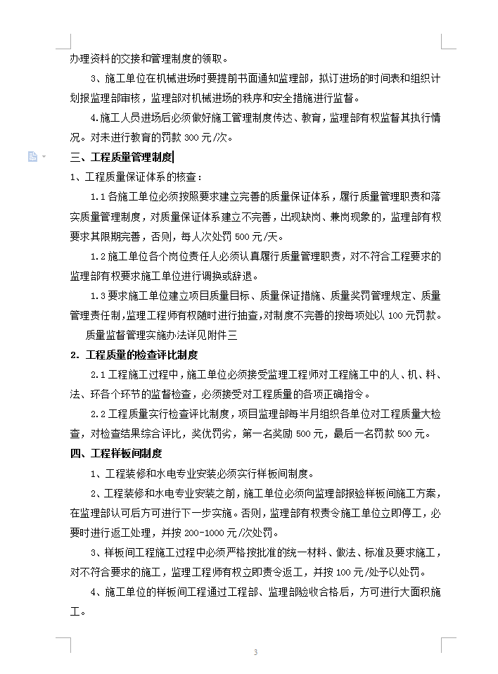 工程资料管理制度:1、参建各方必须以文件形式传递信息和要求。对于施工单位拒绝接收建设、监理单位文件行为,一次罚款500元人民币。2、所有工程报验文件纸张均采用A4纸或套用质量监督站的相关表格,对擅自修改的文件形式必须经监理部批准后才能采用,否则,有权拒收。3、文件内容必须书写规范,字迹清晰、不得有私涂乱改现象,严格按照归档要求进行统一编号和分类并归档整齐。4.工程施工过程中严格按照签字程序执行,严禁出现代签现象,在正确部位加盖公章。5.工程检验批施工前,施工单位必须以书面形式报验,书面材料经审核合格后方可进行工程验收,对未按要求进行报验的,监理部有权拒绝验收。6.对所报验工程内容必须附工程报验单,工程报验内容填写真实、齐全,必要时附带真实有效的工程证明文件,资料交接后及时分类归档登记。7.施工交工资料必须按照相关归档备案资料要求进行整理,工程资料必须与工程实际进度同步,严禁事后补签手续。8.工程施工来往资料必须完整,对工程施工中提出的问题和书面通知,必须有书面交圈资料。