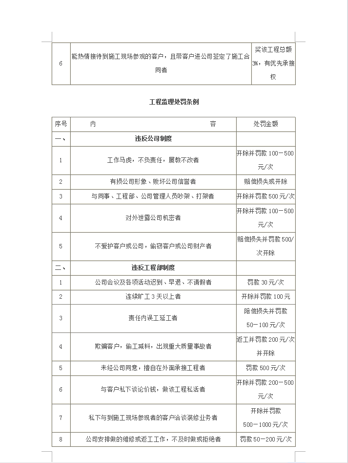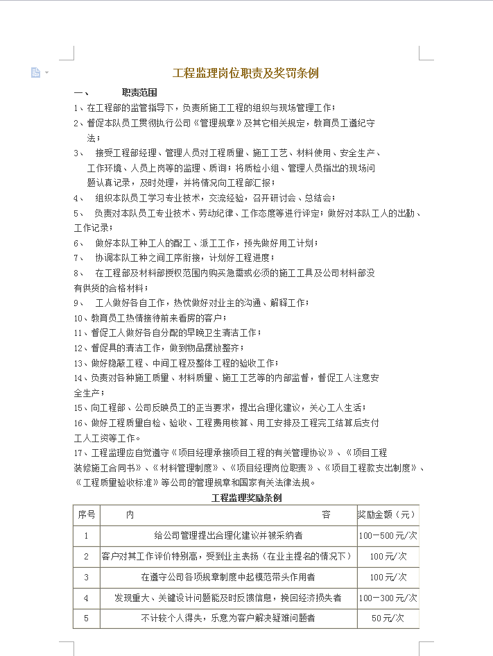职责范围:1、在工程部的监管指导下,负责所施工工程的组织与现场管理工作;2、督促本队员工贯彻执行公司《管理规章》及其它相关规定,教育员工遵纪守法;3、 接受工程部经理、管理人员对工程质量、施工工艺、材料使用、安全生产、 工作环境、人员上岗等的监理、质询;将质检小组、管理人员指出的现场问题认真记录,及时处理,并将情况向工程部汇报;4、 组织本队员工学习专业技术,交流经验,召开研讨会、总结会;5、 负责对本队员工专业技术、劳动纪律、工作态度等进行评定;做好对本队工人的出勤、工作记录;6、 做好本队工种工人的配工、派工工作,预先做好用工计划;7、 协调本队工种之间工序衔接,计划好工程进度;8、 在工程部及材料部授权范围内购买急需或必须的施工工具及公司材料部没有供货的合格材料;9、 工人做好各自工作,热忱做好对业主的沟通、解释工作;10、教育员工热情接待前来看房的客户;11、督促工人做好各自分配的早晚卫生清洁工作;12、督促具的清洁工作,做到物品摆放整齐;13、做好隐蔽工程、中间工程及整体工程的验收工作;14、负责对各种施工质量、材料质量、施工工艺等的内部监督,督促工人注意安全生产;