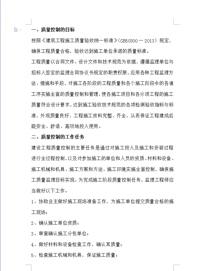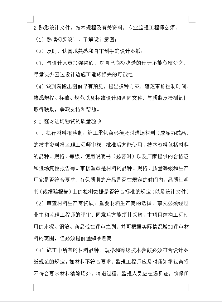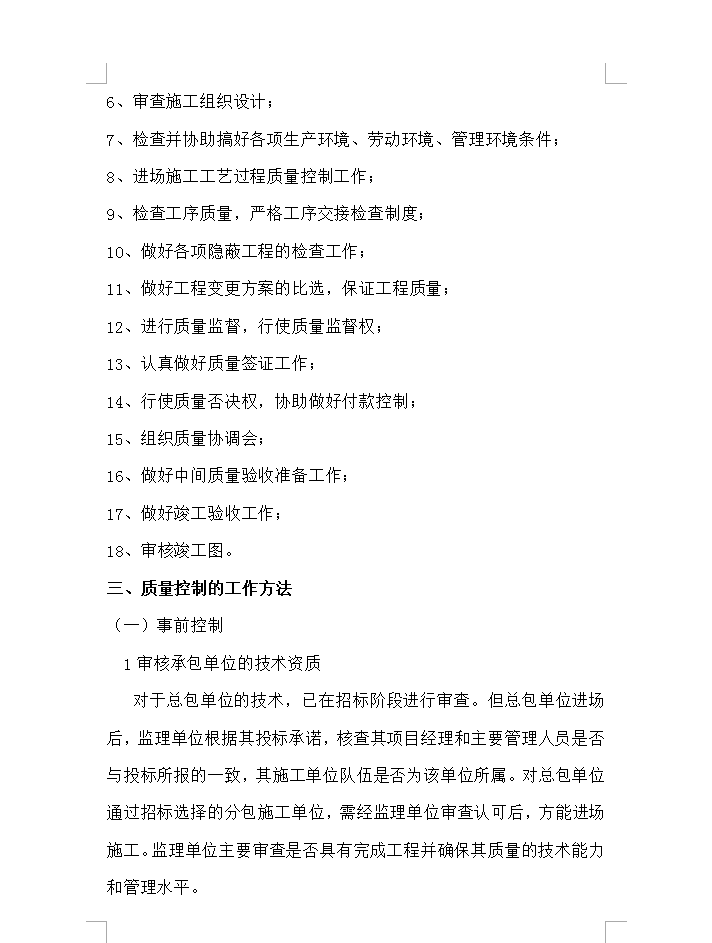 质量控制的工作方法:(一)事前控制:1审核承包单位的技术资质:对于总包单位的技术,已在招标阶段进行审查。但总包单位进场后,监理单位根据其投标承诺,核查其项目经理和主要管理人员是否与投标所报的一致,其施工单位队伍是否为该单位所属。对总包单位通过招标选择的分包施工单位,需经监理单位审查认可后,方能进场施工。监理单位主要审查是否具有完成工程并确保其质量的技术能力和管理水平。2 熟悉设计文件,技术规程及有关资料,专业监理工程师必须:(1)熟读初步设计,了解设计意图;(2)及时、认真地熟悉和自审到手的设计图纸;(3)与设计人员加强沟通,对自己尚没吃透的设计不能贸然处之,尽量减少因边设计边施工造成损失的可能性。(4)做到阶段出图前早有预见,提出多种方案,缩短事前控制时间。熟悉规程、标准、规范以及标准设计和合同文件,与质监及检测部门取得联系,争取支持和帮助。
