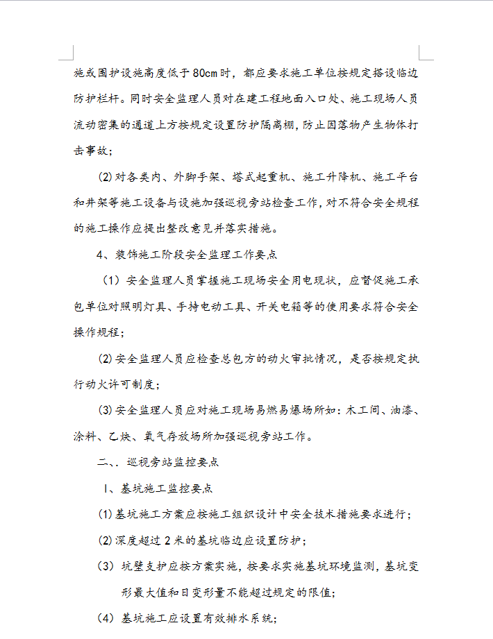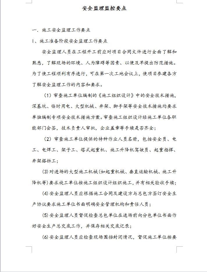 施工安全监理工作要点 :l、施工准备阶段安全监理工作要点:安全监理人员在工程开工前应对项目合同文件进行全面了解和熟悉,了解现场的环境、人为障碍等因素、以便及早提出防范措施。为了使工程顺利有序进行,可在第一次工地会议上,使项目参建各方了解安全监理工作的内容和要求。(1)审查施工单位编制的《施工组织设计》中的安全技术措施,深基坑、临时用电、大型机械、井架、脚手架等安全技术措施均要求单独编制专项安全技术措施方案。审查施工组织设计经施工单位各职能部门会签,技术负责人审批,企业盖章等手续是否齐全;(2)审查施工单位提供的特种作业人员名册,包括安全员、电工、电焊工、架子工、塔式起重机、施工升降机驾驶员、起重指挥、井架搭拆工;(3)对进场的大型施工机械(如起重机械、垂直运输机械、施工升降机等)要求旋工单位按施工组织设计组织施工,并有相关验收手续;(4)安全监理人员应根据施工合同及建设方与总包方签订安全生产协议要求施工单位书面明确安全管理机构和责任人员; (5)安全监理人员督促检查总包单位在进场前向分包单位书面作好安全生产总交底工作,并保存相关交底记录;(6)安全监理人员应检查现场围挡封闭情况,督促施工单位按要求设置围挡高度,并选用合适围挡砌筑材料:(7)安全监理人员开工前应督促总包单位根据建设方提供地下管线资料,摸清管线位置、走向,采取相应安全保护措施,并核实保护措施落实情况;(8)安全监理人员应对施工中新材料、新技术运用进行必要的了解和调查,以求及时发现存在的安全隐患。