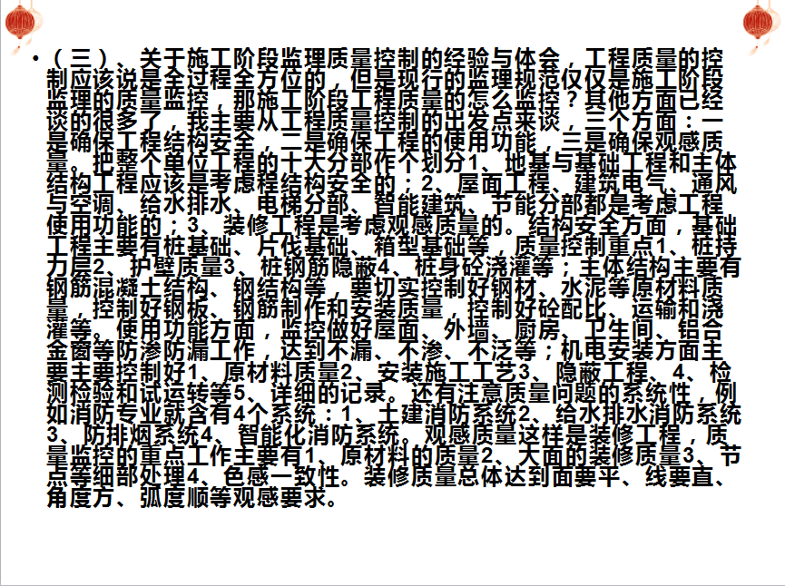 关于施工阶段监理进度控制的经验与体会 影响项目进度的因素非常复杂且非常之多,如资金到位情况 、施工单位选择的好坏,设计图纸是否完善、外部环境的优劣等等,但是这些因素往往又都不是监理所能左右的,因此在进度控制上,留给监理施展的空间似乎并不多。但是作为监理的职责应该对工程进度进行有效的控制,如果方法得当监理还是可以发挥应有的作用的。1、要求总包单位工程进场以后根据合同以及具体工程特点、外部环境情况制定总施工进度计划,这各分包制定相应的分包施工计划,大型项目的监理可以制定总控制计划,但是出发点是不一样的,施工单位的总进度计划是用来指导施工的,监理的总控计划是用来在满足进度要求时约束建设单位、施工单位的责任行为的,同时也是作为监理控制进度的措施。2、形成会议例会检查制度,要求施工单位在定期的例会前必须提交本周进度情况和下周进度安排情况书面报告制度,此报告要求盖章并发建设单位,监理单位,这一盖章,无行中就已经是对施工单位有约束了,就是很好的控制措施,定期对比并结合合同取得法规效应。