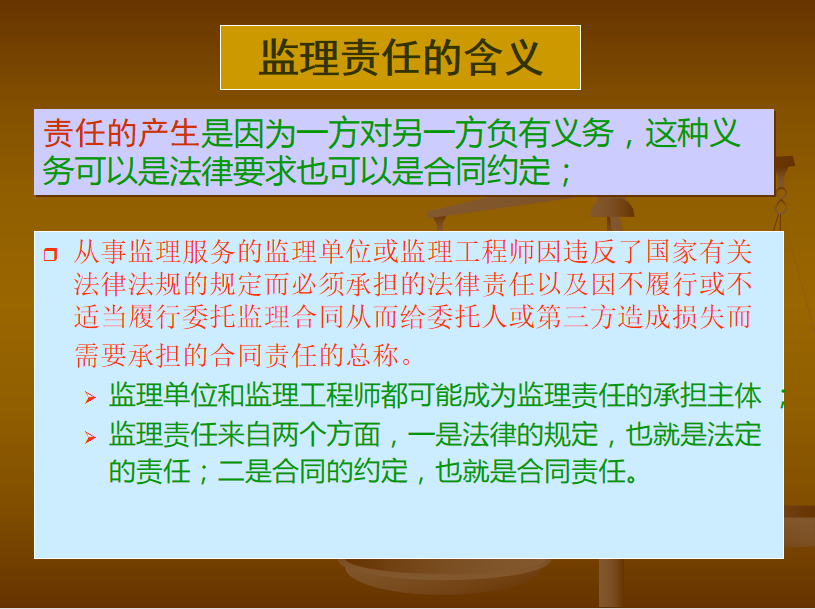 责任的产生是因为一方对另一方负有义务,这种义务可以是法律要求也可以是合同约定;从事监理服务的监理单位或监理工程师因违反了国家有关法律法规的规定而必须承担的法律责任以及因不履行或不适当履行委托监理合同从而给委托人或第三方造成损失而需要承担的合同责任的总称。
