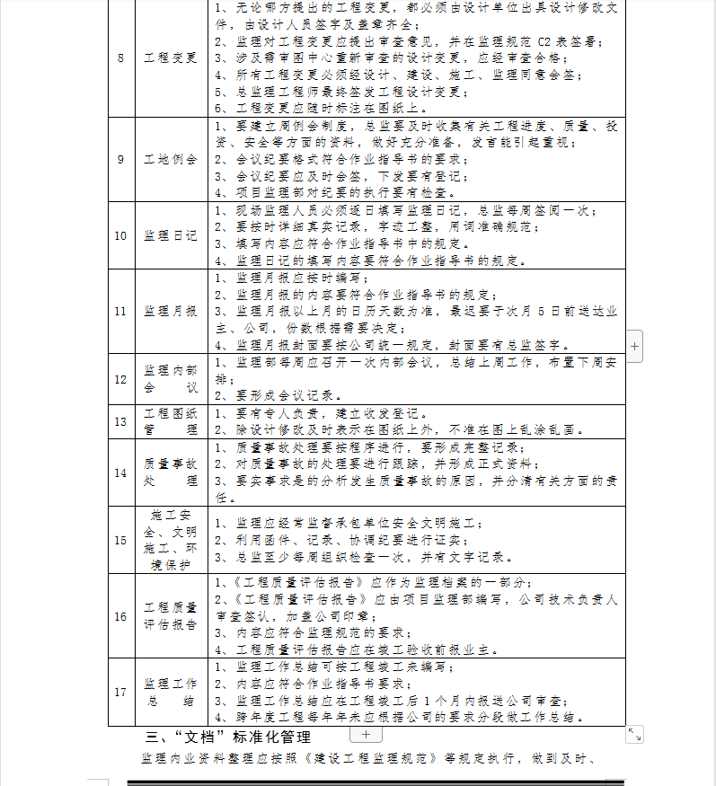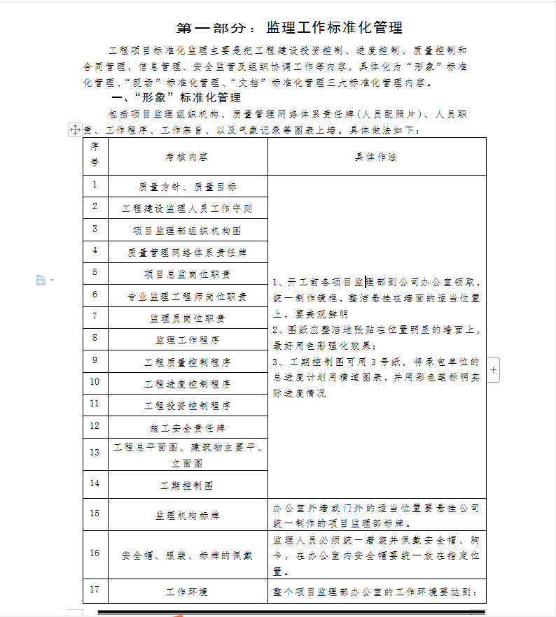 ¹¤³ÌÏîÄ¿±ê×¼»¯¼àÀíÖ÷ÒªÊǰѹ¤³Ì½¨ÉèͶ×Ê¿ØÖÆ¡¢½ø¶È¿ØÖÆ¡¢ÖÊÁ¿¿ØÖƺͺÏͬ¹ÜÀí¡¢ÐÅÏ¢¹ÜÀí¡¢°²È«¼à¹Ü¼°×é֯Эµ÷¹¤×÷µÈÄÚÈÝ£¬¾ßÌ廯Ϊ¡°ÐÎÏó¡±±ê×¼»¯¹ÜÀí¡¢¡°ÏÖ³¡¡±±ê×¼»¯¹ÜÀí¡¢¡°Îĵµ¡±±ê×¼»¯¹ÜÀíÈý´ó±ê×¼»¯¹ÜÀíÄÚÈÝ¡£°üÀ¨ÏîÄ¿¼àÀí×éÖ¯»ú¹¹¡¢ÖÊÁ¿¹ÜÀíÍøÂçÌåϵÔðÈÎÅÆ(ÈËÔ±ÅäÕÕÆ¬)¡¢ÈËÔ±Ö°Ôð¡¢¹¤×÷³ÌÐò¡¢¹¤×÷×ÚÖ¼¡¢ÒÔ¼°ÆøÏó¼Ç¼µÈͼ±íÉÏǽ¡£