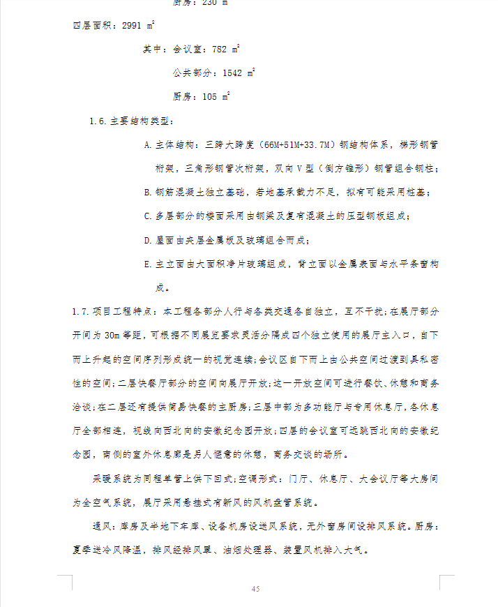 本工程各部分人行与各类交通各自独立,互不干扰;在展厅部分开间为30m等距,可根据不同展览要求灵活分隔成四个独立使用的展厅主入口,自下而上升起的空间序列形成统一的视觉连续;会议区自下而上由公共空间过渡到具私密性的空间;二层快餐厅部分的空间向展厅开放;这一开放空间可进行餐饮、休憩和商务洽谈;在二层还有提供简易快餐的主厨房;三层中部为多功能厅与专用休息厅,各休息厅全部相连,视线向西北向的安徽纪念园开放;四层的会议室可远跳西北向的安徽纪念园,南侧的室外休息廊是另人惬意的休憩,商务交谈的场所。