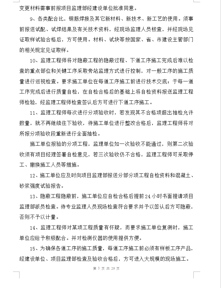 工程施工过程中:1、施工单位应于合同签订后,以书面形式通报施工现场项目组织机构及公司在该工程项目的负责人(包括姓名、职务、职称、岗位证),即公司派驻的项目经理,代表公司行使施工合同赋予的权利,履行施工合同义务,负责签发来往信函。2、开工前施工单位应报送施工组织设计(或施工方案)及施工总进度计划,经项目监理部审核签批后方可实施。无施工组织设计(或施工方案)的不得开工。3、施工单位应于开工前书面申报开工申请报告(附施工准备情况资料),经项目监理部报经建设单位同意,并签发开工令后方可开工。4、施工单位应组织有关技术人员抓紧做好图纸自审工作,并参加由建设单位主持的施工阶段设计图纸交底会议。5、施工分包单位管理:若投标文件中已明确分包单位,总包单位只需向项目监理部报送分包单位资质等有关资料进行备案;除此之外,总包单位要选择专业分包队伍时,应首先向项目监理部申报分包单位资质等有关资料,待总监理工程师审查同意后,总包单位才能与分包单位签订分包合同。6、开工前施工单位应编制综合项目清单,以便于今后申报和审批月进度款时,按照完成的实物工程量计算进度款。