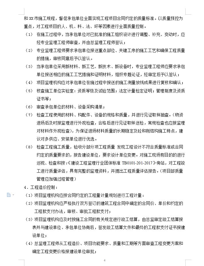 (3)审定施工组织设计(施工方案):施工组织设计是用来指导拟建工程施工全过程中各项活动的组织技术经济综合性文件。为完成本项目合同规定内容所编制的指导施工、实现科学管理的策划文件。季节性施工方案和专项施工方案(如:雨季、冬施、防水工程等)。工程项目开工前,由总监组织专业监理工程师审查承包单位报送的施工组织设计(方案)报审表,提出审查意见,并经总监审核签认后报建设单位。