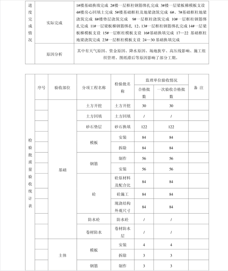 本月材料、设备、人员充足,监理人员对进场的材料、设备进行了检查验收,不合格的材料已清退出场,保证了合格的材料用于工程上,对项目管理人员进行了审查,基本符合要求,满足项目施工需要;本月工程款支付发生两次,监理均依据合同和实际情况进行了签认;工程质量总体较好,相对较差的是6、7、10、11. 21、22#楼,主要原因是项目部人员质量意识不强,管理不到位;