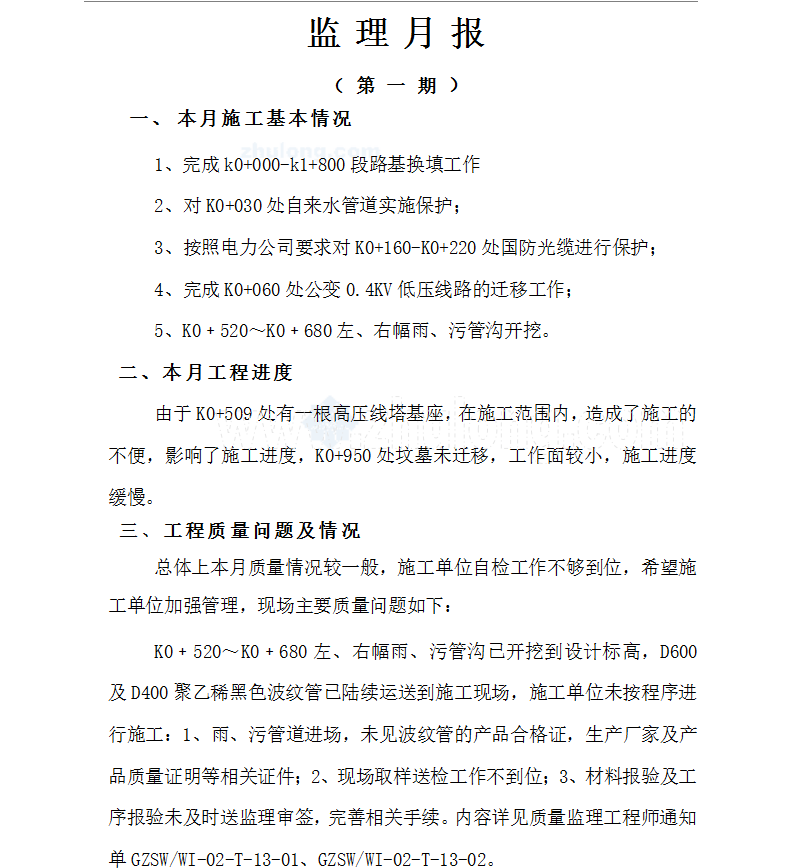 由于K0+509处有一根高压线塔基座,在施工范围内,造成了施工的不便,影响了施工进度,K0+950处坟墓未迁移,工作面较小,施工进度缓慢。总体上本月质量情况较一般,施工单位自检工作不够到位,希望施工单位加强管理;
