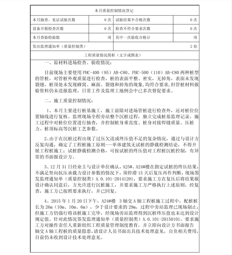 本月主要进行桩基施工,施工前除对进场管桩进行检查外,还对桩位位置轴线进行复核。监理现场全程旁站整个沉桩过程,独立完成桩基监理记录。施工过程中对桩位位置进行抽查,并控制桩身垂直度、桩身对接焊缝质量、压桩力桩顶标高等沉桩工艺参数。
