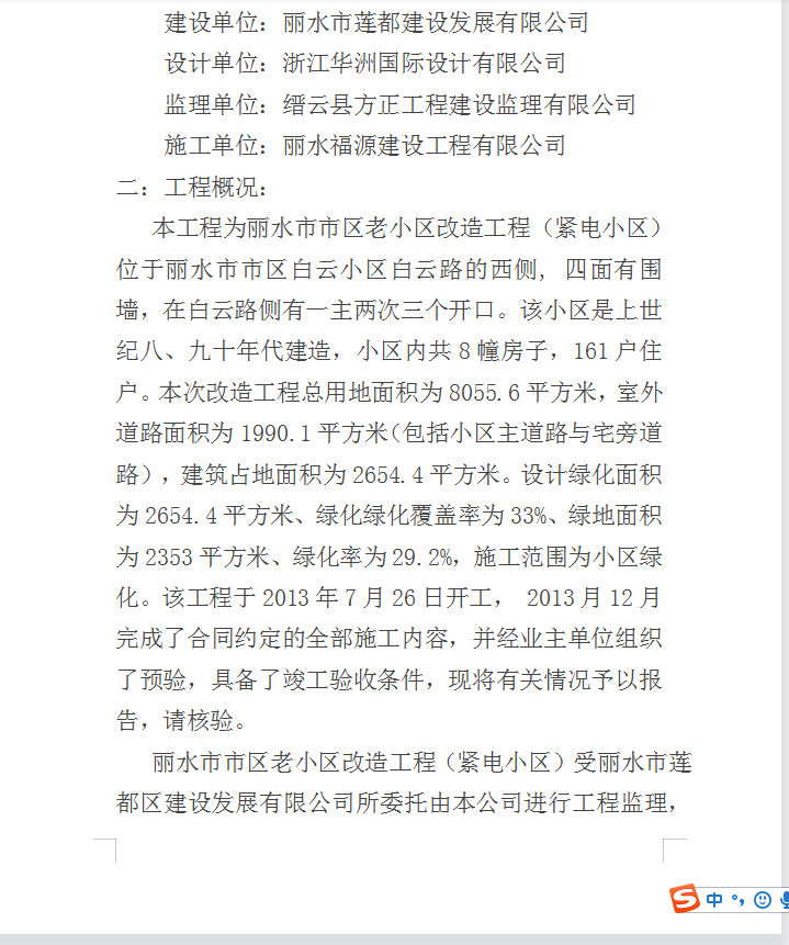 本工程为xx市市区老小区改造工程(紧电小区)位于xx市市区白云小区白云路的西侧, 四面有围墙,在白云路侧有一主两次三个开口。该小区是上世纪八、九十年代建造,小区内共8幢房子,161户住户。本次改造工程总用地面积为8055.6平方米,室外道路面积为1990.1平方米(包括小区主道路与宅旁道路),建筑占地面积为2654.4平方米。设计绿化面积为2654.4平方米、绿化绿化覆盖率为33%、绿地面积为2353平方米、绿化率为29.2%,施工范围为小区绿化。该工程于2013年7月26日开工, 2013月12月完成了合同约定的全部施工内容,并经业主单位组织了预验,具备了竣工验收条件,现将有关情况予以报告,请核验。