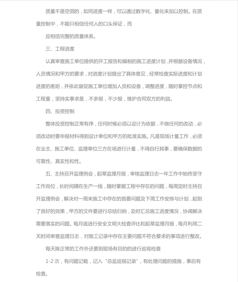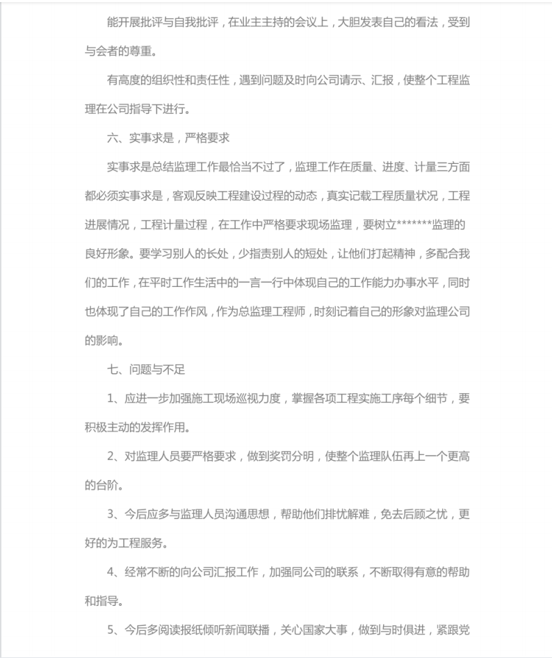 20xx年是*****工程建设关键的一年,该工程楼栋多、面积大、任务重、人员少、事情多。回顾一年来的工作, 在各方的统一协调下 , 在全体监理人员的辛勤工作和努力下,我们的监理工作得到了施工方的尊重和甲方的肯定,工程质量在监理的控制下通过质监站检测和验收结论,工程质量均符合设计要求,达到合格标准。做到了整体工作稳步进行施工中未发生过任何质量事故及安全事故,没有人员伤亡,圆满完成了监理过程中的各项工作,并荣获了****“双文明”工地称号,给公司获得了荣誉。节约了经费,取得了比较好的成果。