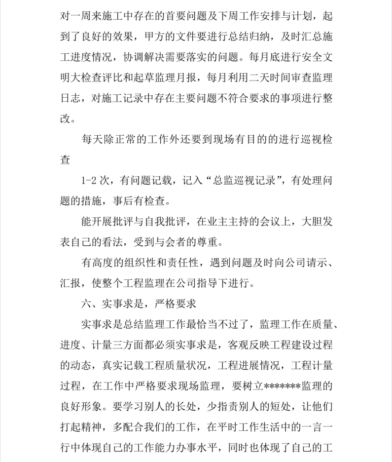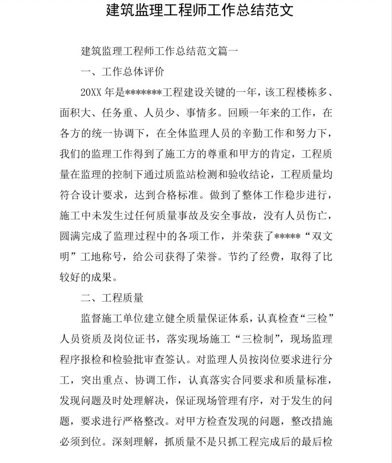 20XX年是******工程建设关键的一-年,该工程楼栋多、面积大、任务重、人员少、事情多。回顾一-年来的工作,在各方的统一协调下,在全体监理人员的辛勤工作和努力下,我们的监理工作得到了施工方的尊重和甲方的肯定,工程质量在监理的控制下通过质监站检测和验收结论,工程质量均符合设计要求,达到合格标准。做到了整体工作稳步进行,施工中未发生过任何质量事故及安全事故,没有人员伤亡,圆满完成了监理过程中的各项工作,并荣获了****“双文明”工地称号,给公司获得了荣誉。节约了经费,取得了比较好的成果。