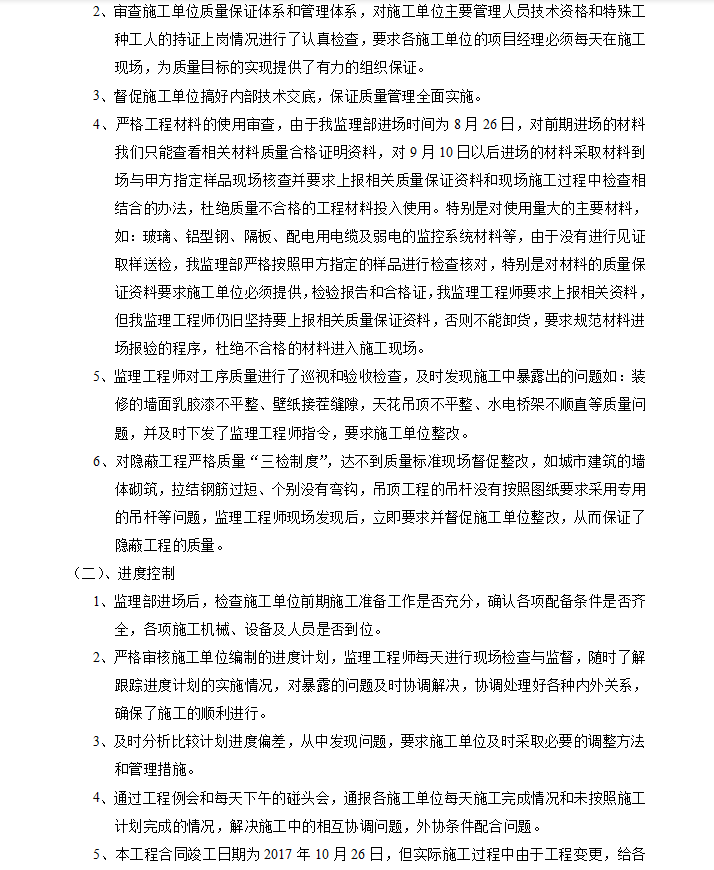 本装修工程面积88㎡,总工期30日历天,工程量大、工期紧,各施工单位交叉作业频繁,施工协调难度大。坚持装修施工质量标准,严格检查,以预防为主,加强工序质量控制。按照装修质量控制监理程序,采取各种监理措施,确保了工程质量监理目标的实现。