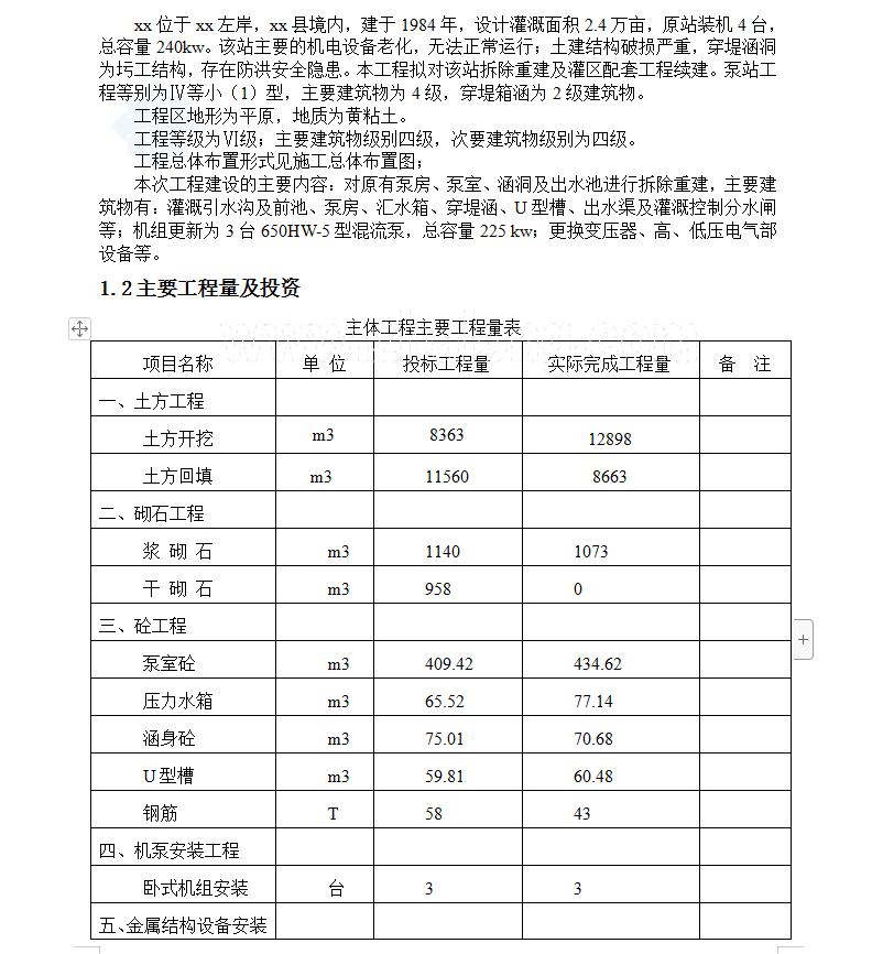 xxλÓÚxx×ó°¶£¬xxÏØ¾³ÄÚ£¬½¨ÓÚ1984Ä꣬Éè¼Æ¹à¸ÈÃæ»ý2.4ÍòĶ£¬Ô­Õ¾×°»ú4̨£¬×ÜÈÝÁ¿240kw¡£¸ÃÕ¾Ö÷ÒªµÄ»úµçÉ豸ÀÏ»¯£¬ÎÞ·¨Õý³£ÔËÐУ»ÍÁ½¨½á¹¹ÆÆËðÑÏÖØ£¬´©µÌº­¶´ÎªÛع¤½á¹¹£¬´æÔÚ·Àºé°²È«Òþ»¼¡£±¾¹¤³ÌÄâ¶Ô¸ÃÕ¾²ð³ýÖØ½¨¼°¹àÇøÅäÌ×¹¤³ÌÐø½¨¡£±ÃÕ¾¹¤³ÌµÈ±ðΪ¢ôµÈС£¨1£©ÐÍ£¬Ö÷Òª½¨ÖþÎïΪ4¼¶£¬´©µÌÏ亭Ϊ2¼¶½¨ÖþÎï¡£