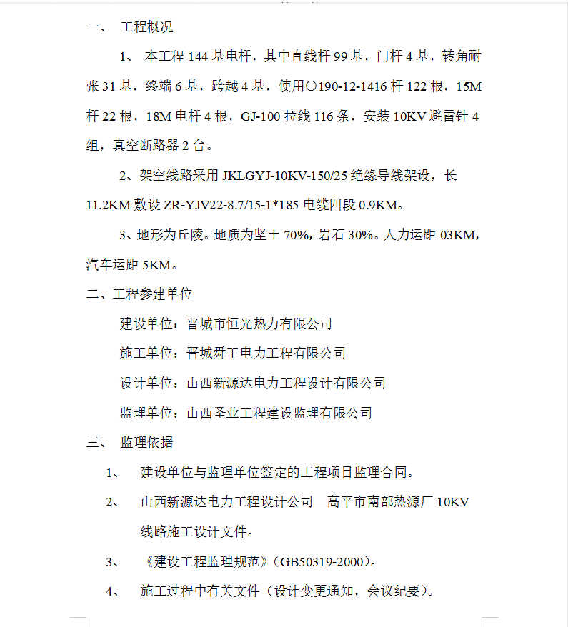 ±¾¹¤³Ì144»ùµç¸Ë£¬ÆäÖÐÖ±Ï߸Ë99»ù£¬ÃŸË4»ù£¬×ª½ÇÄÍÕÅ31»ù£¬ÖÕ¶Ë6»ù£¬¿çÔ½4»ù£¬Ê¹Óáð190-12-1416¸Ë122¸ù£¬15M¸Ë22¸ù£¬18Mµç¸Ë4¸ù£¬GJ-100À­Ïß116Ìõ£¬°²×°10KV±ÜÀ×Õë4×飬տ¿Õ¶Ï·Æ÷2̨¡£¼Ü¿ÕÏß·²ÉÓÃJKLGYJ-10KV-150/25¾øÔµµ¼Ïß¼ÜÉ裬³¤11.2KM·óÉèZR-YJV22-8.7/15-1*185µçÀÂËĶÎ0.9KM¡£µØÐÎΪÇðÁê¡£µØÖÊΪ¼áÍÁ70%£¬ÑÒʯ30%¡£ÈËÁ¦Ô˾à03KM£¬Æû³µÔ˾à5KM¡£