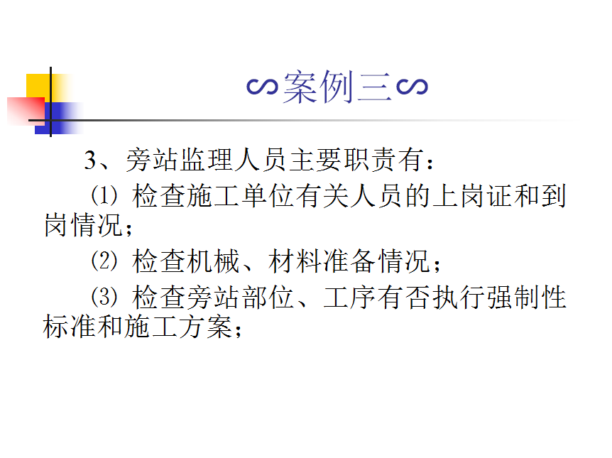 1、旁站监理范围和内容:厂房基础工程的混凝土灌注桩和杯型基础混凝土浇筑;厂房主体结构工程的柱、屋架、吊车梁混凝土浇筑,柱、屋架、吊车梁、屋面板吊装,钢支撑安装。2、旁站监理程序:监理单位制定旁站监理方案,并送施工单位;施工单位在需要实施旁站的关键部位、关键工序进行施工前,24小时书面通知监理机构,监理机构安排旁站人员按旁站监理方案实施监理。3、旁站监理人员主要职责有: ⑴ 检查施工单位有关人员的上岗证和到岗情况;⑵ 检查机械、材料准备情况;⑶ 检查旁站部位、工序有否执行强制性标准和施工方案;⑷ 核查进场材料、构配件、设备、商品混凝土的质量检测报告,监督施工单位的检验或委托第三方复验。4、旁站人员发现施工单位有违反强制性标准的行为时,应立即报告监理工程师或总监理工程师处理;5、凡旁站监理人员未在旁站监理记录上签字的,不得进行下一道工序施工。