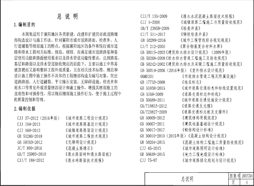 本图集适用于xxx地区各类新建、改建和扩建的市政道路细部构造设计与施工作法。针对襄阳市城市道路路面、检查井、人行道铺装等细部施工的特点,根据襄阳地区的条件和现行城市道路和排水工程相关标准、规范、规程,在满足城市道路路基和基层使用功能和路面使用要求以及排水管道功能性要求,达到路基、基层和路面以及排水管道验收规范的前提下,主要以施工中容易被忽视而又影响整体工程外观质量,且在相关技术标准、规范和设计施工图中施I操作不具体的工程细部构造为编写对象。突出道路路面、人行道铺装、平立缘石安装、无障碍设施、检查井和雨水口等常见外观质量细部设计和施工操作,增强其细部施工的直观性和可操作性,用以规范细部施I操作行为,便于施I过程中的质量控制和管理。